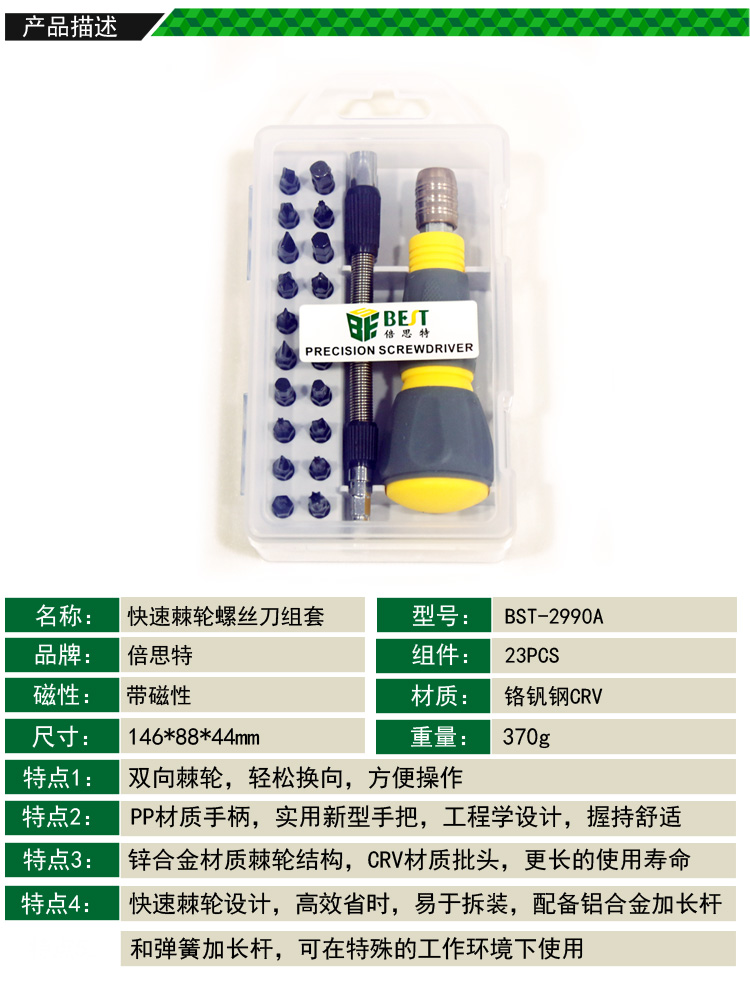 返回當(dāng)前位置: 首頁(yè) / 產(chǎn)品中心 / BST-2990A 23件套 快速棘輪螺絲刀組套