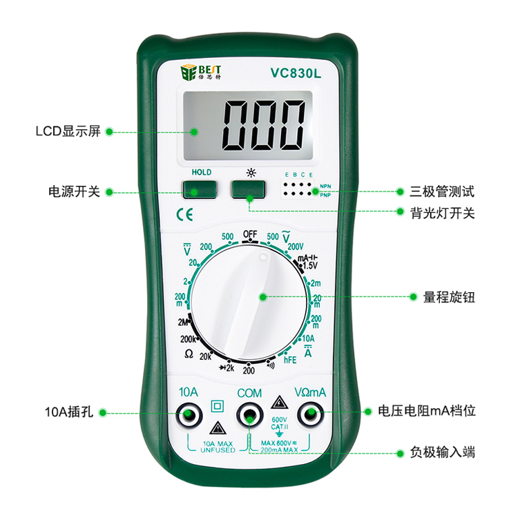 BST-VC830L 雙背光數(shù)字萬用表 手動量程 三位半背光顯示屏