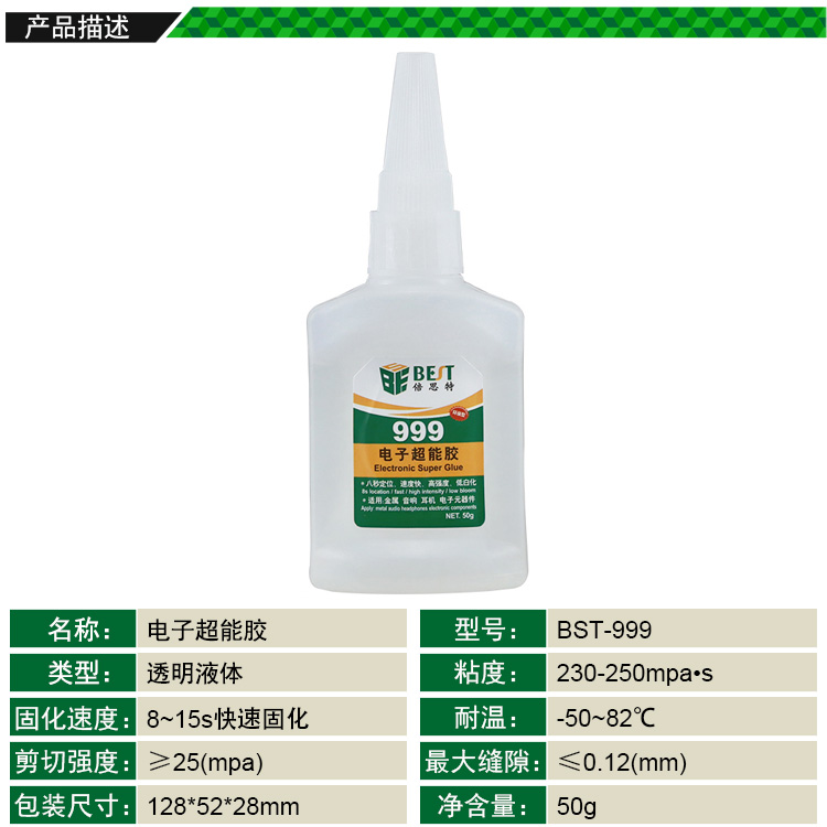 ? 產品名稱: 電子超能膠 瞬間膠? 產品型號: BST-999? 產品類別: 膠水膠紙系列