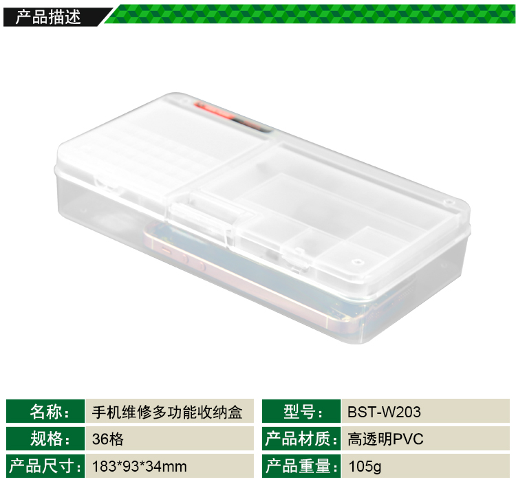 ? 產品名稱: 手機維修多功能收納盒? 產品型號: BST-W203? 產品類別: 元件盒系列